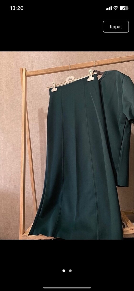 Koyu yeşil renkte olan bu takım, drapeli tasarımı ve rahat kesimiyle ofis için uygundur, sentetik kumaştan üretilmiştir.