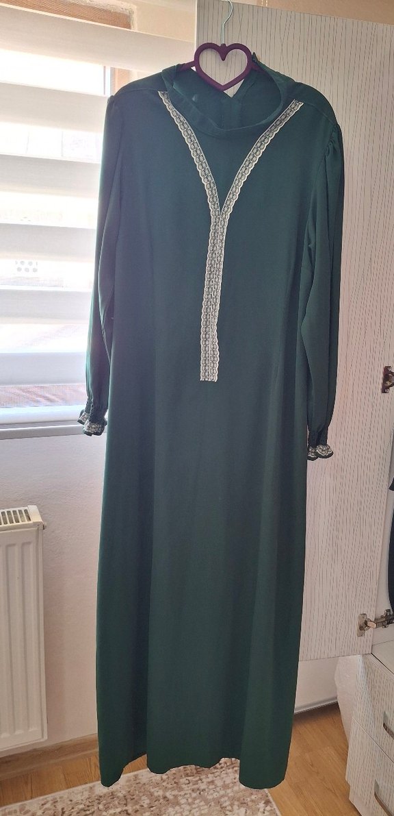 Zümrüt yeşili yüksek yakalı ve uzun kollu, işlemeli detaylara sahip, regular fit kadın uzun elbise. Özel dikimdir az kullanılmıştır medine ipeğidir 46 beden