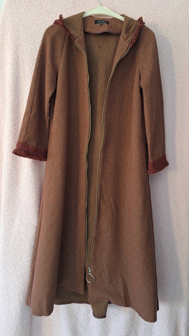 Uzun , bohem tarzda, fermuarlı ve geniş kesim kaban. Yumuşak ve sıcak kumaş, uzun kollu, günlük kullanıma uygun.