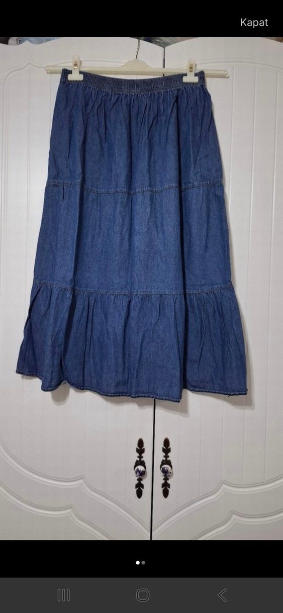 Lacivert uzun kot etek, bol kesim ve fırfır detaylarıyla bohem tarzını yansıtıyor, günlük kullanım için uygun.