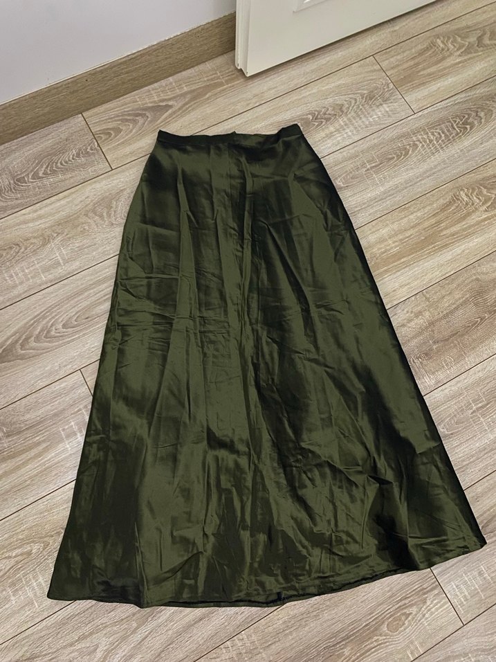 Bu uzun etek, koyu haki saten kumaşla, bol kesim içi astarlı ve tüldür