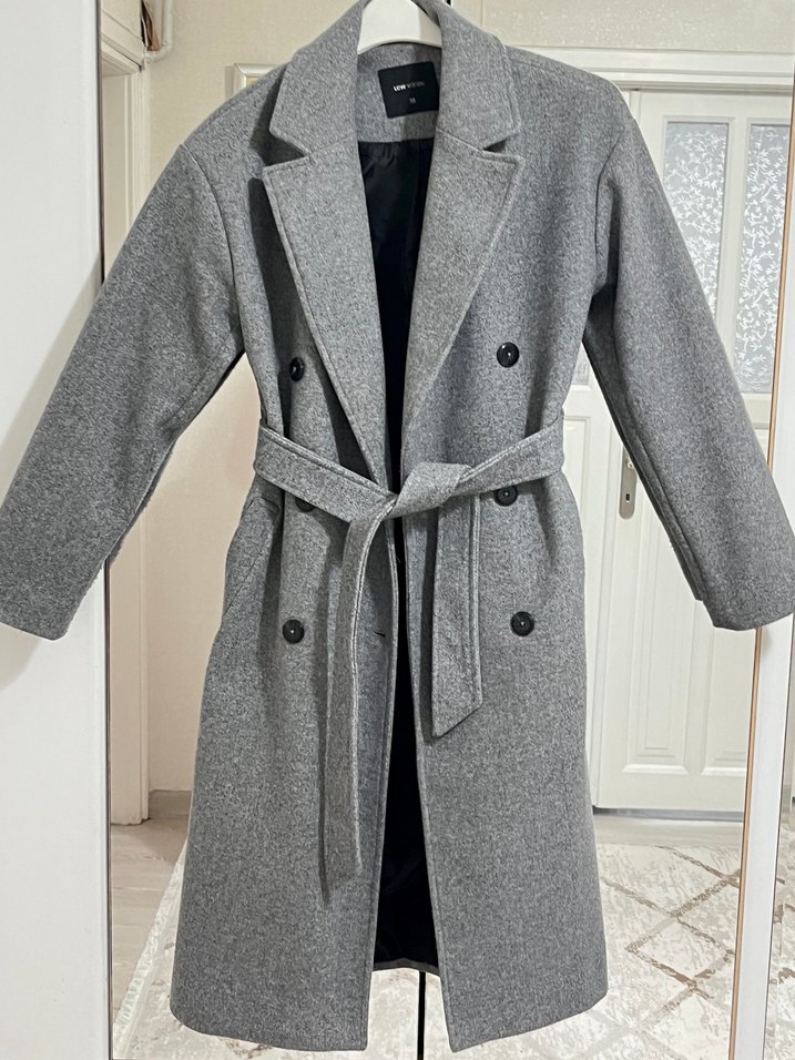 Siyah düğmeli ve kuşaklı uzun gri kaban, yumuşak dokulu ve siyah astarlıdır. Mağaza durumundadır.