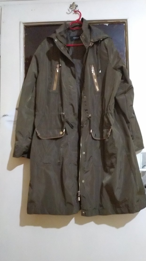 Kadınlar için uzun, bol kesim, uzun kollu, yeşil renkli yağmurluk. Fermuarlı cepler ve çıtçıtlı detaylar içerir. Günlük kullanıma uygundur. ️