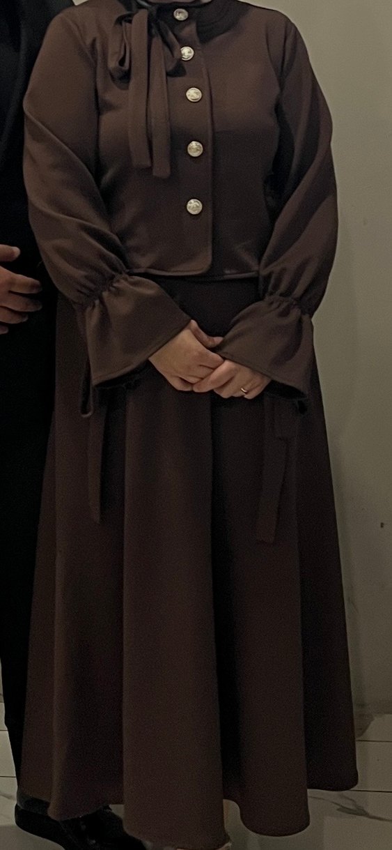 Kadınlar için uzun kahverengi, klasik tarzda, düz desenli ve uzun kollu, normal kesim takım. 1 kez giydim. temizdir