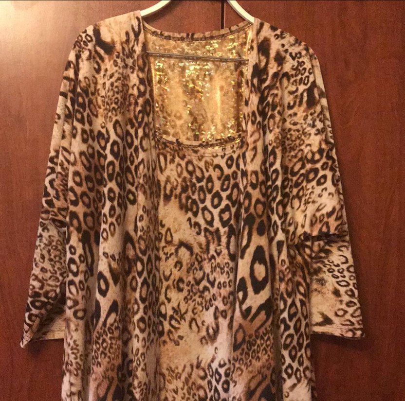 bol kesim ve uzun kollu, parlak kahverengi leopar desenli ikili takım. İçi ince askılı dışı yarasa kesim. Özel dikim. Ölçüler son fotoda var . Mevsimlik hafif parlak çok şık durulu var