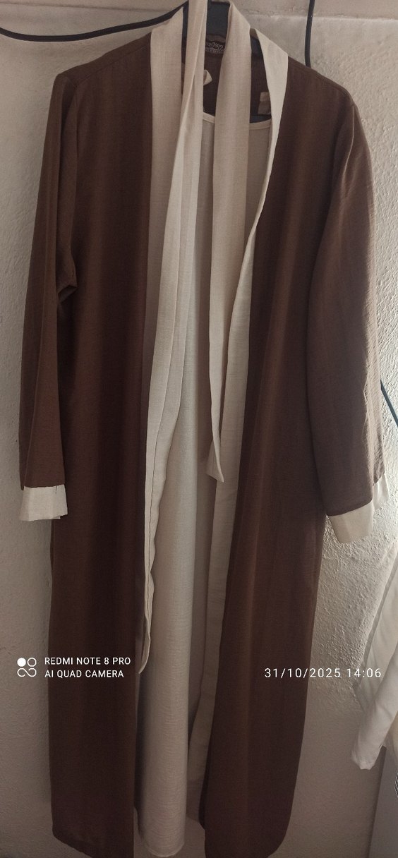 Kadınlar için uzun, rahat kesim ve uzun kollu kahverengi elbise ve abaya.Desensiz ve konforlu bir tasarıma sahiptir. keten takim
