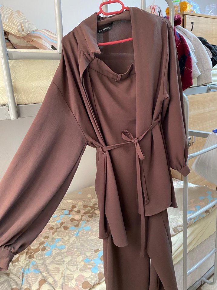 Takım fiyatıdır. Kadınlar için uzun ve salaş kesim kahverengi takım. Uzun kollu, minimalist ve çağdaş tarzda, bağlamalı. Düz ve yumuşak kumaşlı. Bir kere giyildi sadece kusursuz
