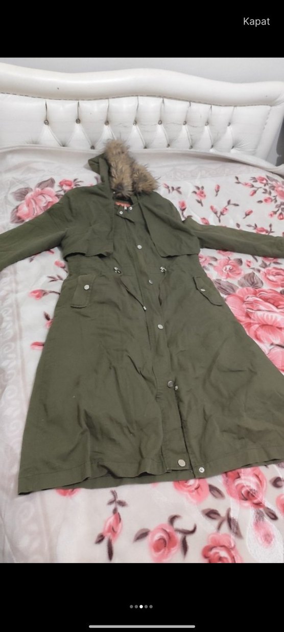 Kadınlar için uzun, kamuflaj desenli, kürklü kapüşonlu mont. Sentetik kumaştan, bol kesim, uzun kollu ve yakası notched lapel. Günlük rahat kullanım için uygundur.