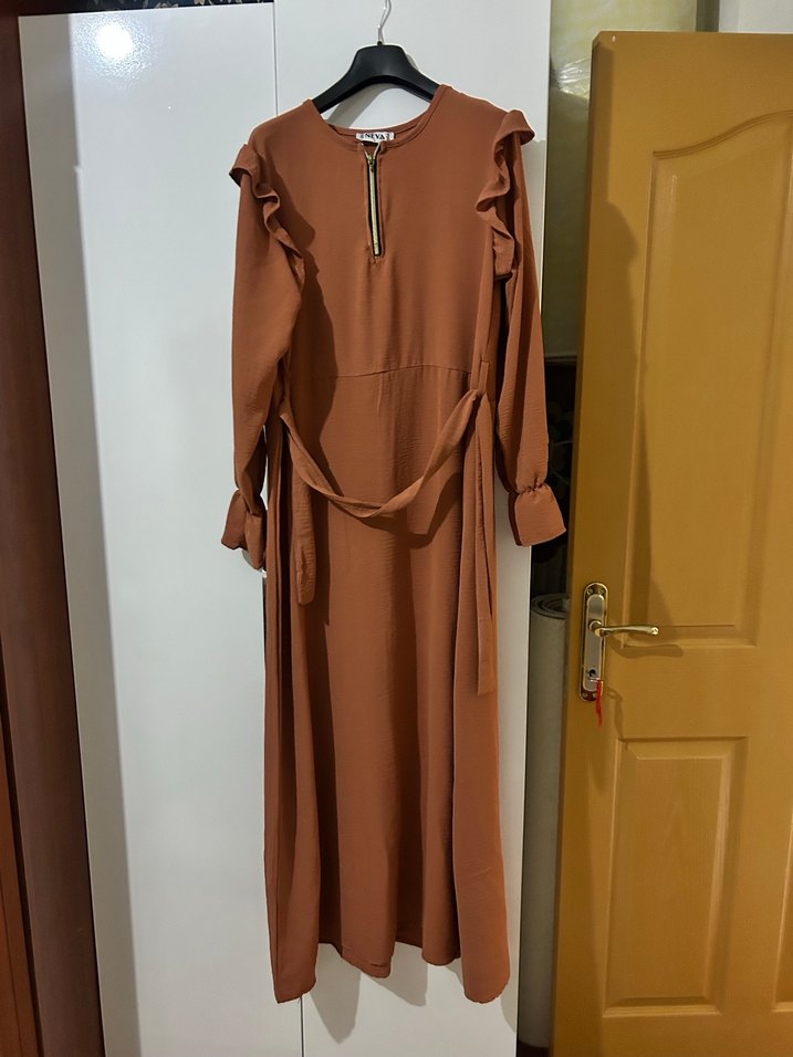 Uzun kollu, yüksek yakalı ve kemerli beliyle bol kesim elbise. Kollarında volan detayları ve ön fermuar bulunur. Düz koyu bej renkte, sentetik kumaştan üretilmiştir. Günlük ve sade şıklık için uygundur.
