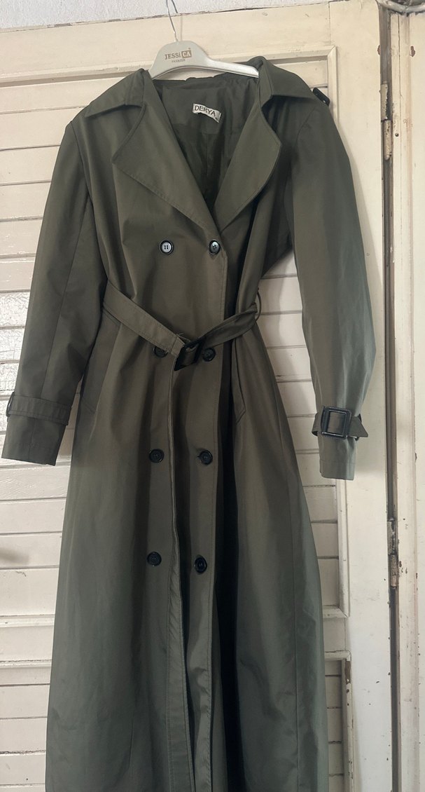 Kadınlar için uzun boy, kemerli trençkot. Notlu yaka, askılı kol ve düz bej renkli sentetik kumaştan yapılmıştır. Günlük kullanım için uygundur.