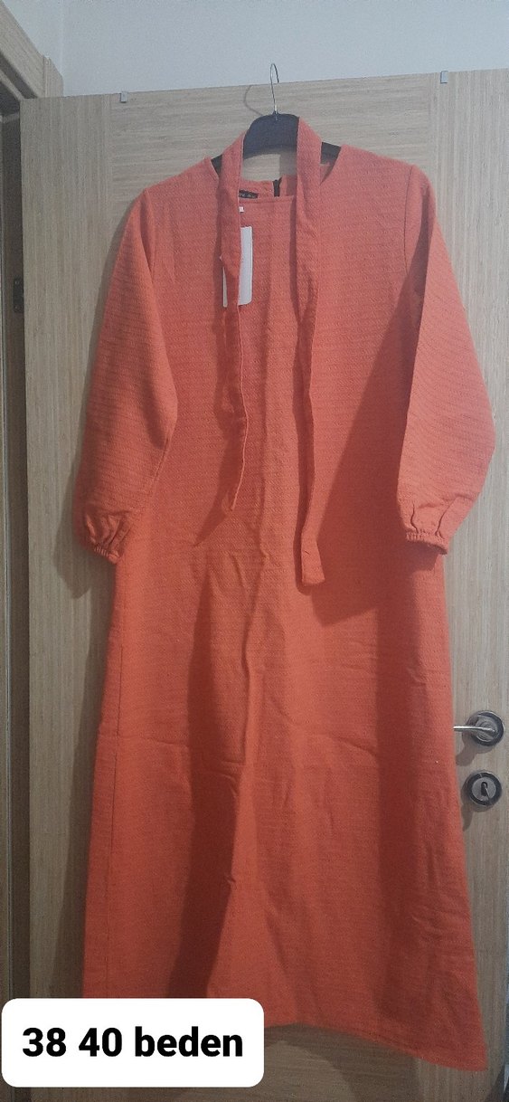 Turuncu uzun keten elbise, bol kesim ve uzun kolludur. Drapeli tasarımı, yuvarlak yaka ve bohem tarzıyla günlük kullanıma uygundur.38 40 beden sefamerve markası.