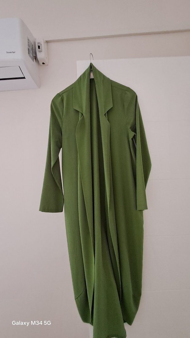 Kadın haki uzun kimona yakalı ve drapeli tasarıma sahip, uzun kollu, sentetik yumuşak kumaştan, rahat kesim. Minimalist ve çağdaş tarz için uygundur.