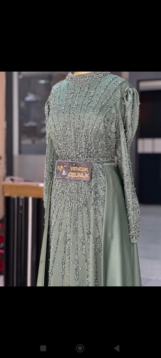 Boncuk işlemeli, V yaka ve uzun kollu haki uzun abiye elbise. Düz kesim ve bohem tarzda, düğünler için uygun. ✨