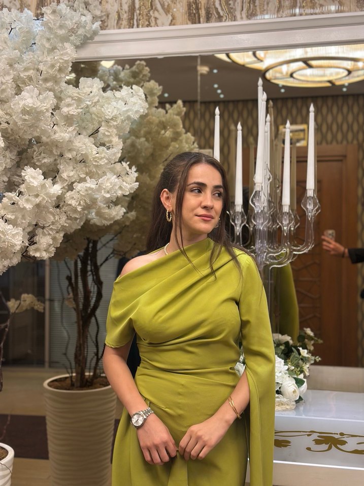Uzun, askısız haki elbise, parlak saten kumaş ve uzun kollu, drapeli tasarımıyla düğünler için modern ve şık bir görünüm sunar.