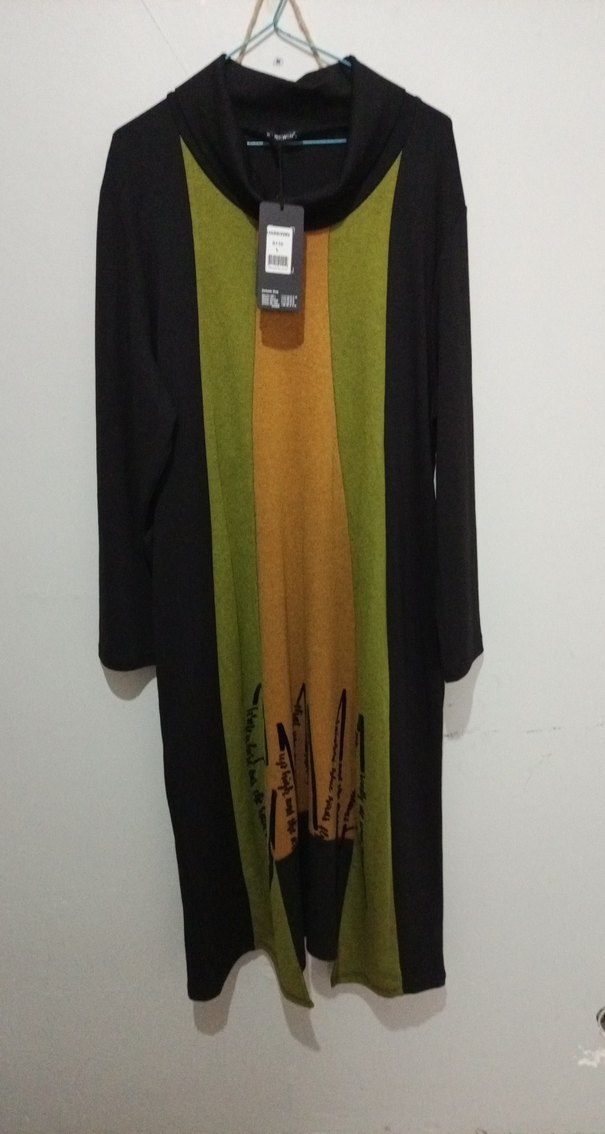 Bu bol kesim kadın triko elbise, uzun kollu ve yüksek yakalıdır. Yumuşak ve sıcak kumaştan, haki tonlarında drapeli ve baskılı desene sahiptir. Sokak modası için avant-garde tarzda. hıc gıyılmedı