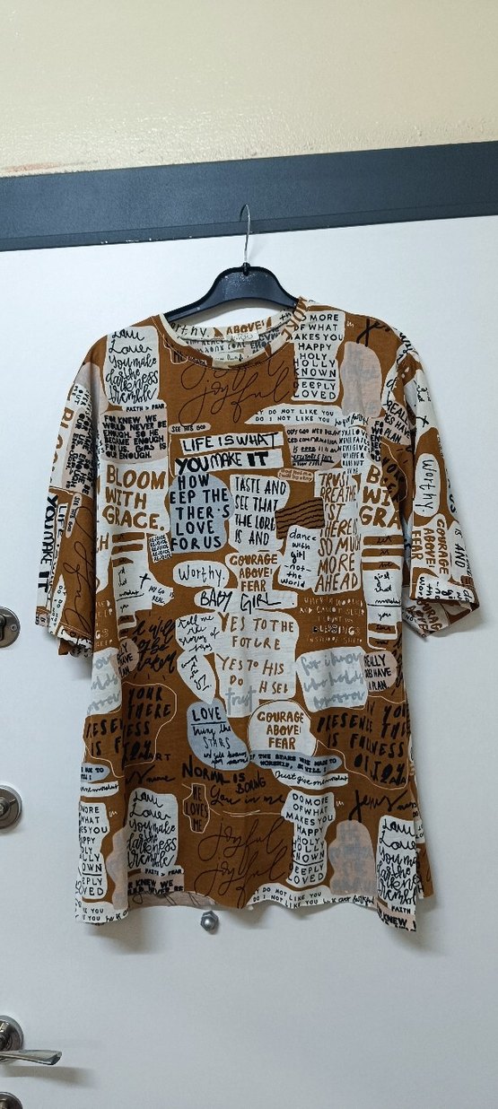 Kahverengi, kısa kollu, yuvarlak yaka, uzun kesim ve bol kesim tekstil tişört. Üzerinde baskılı yazılar ve grafiklerle sokak stili, bohem ve retro havası yansıtıyor. ✨