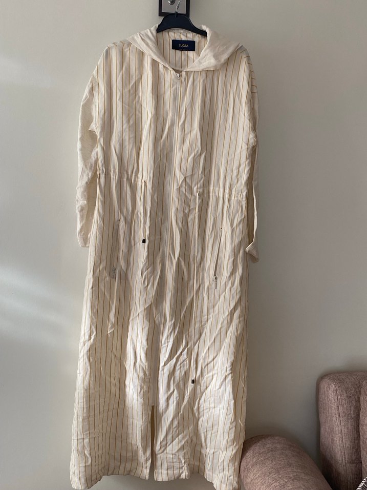 Kadınlar için uzun kollu, salaş kesim ve uzun boyda, ince çizgili beyaz renkte sade ve minimalist tarzda kapüşonlu elbise/ pardesü