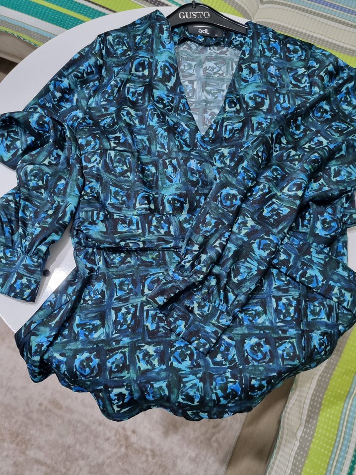 adl marka, s beden, kruvaze bağlamalı saten bluz. Üstte duruşu daha güzel saten olduğu için fotoğraflarda modeli tam belli olmuyor