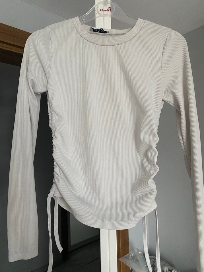 Uzun kollu, bisiklet yaka ve büzgülü tasarıma sahip, yumuşak keten kumaştan yapılmış . Beyaz-gri tonlarında, şık ve rahat bir model.