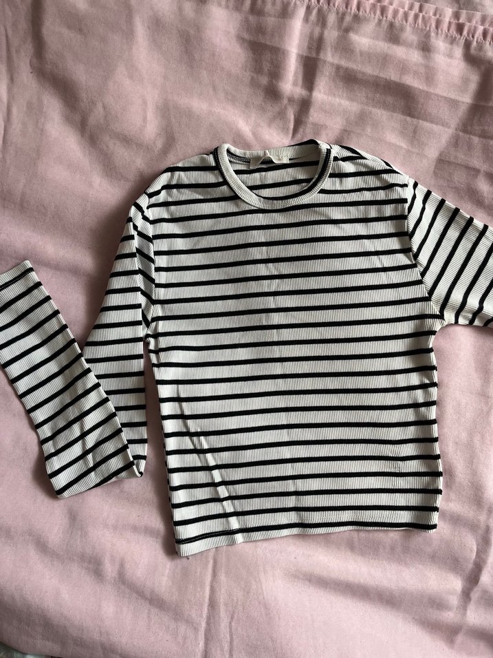 Pamuk kumaştan, uzun kollu ve bisiklet yaka, beyaz zemin üzerine gri çizgili, dar kesim kadın bluzu. Trendy sokak stili için uygun.