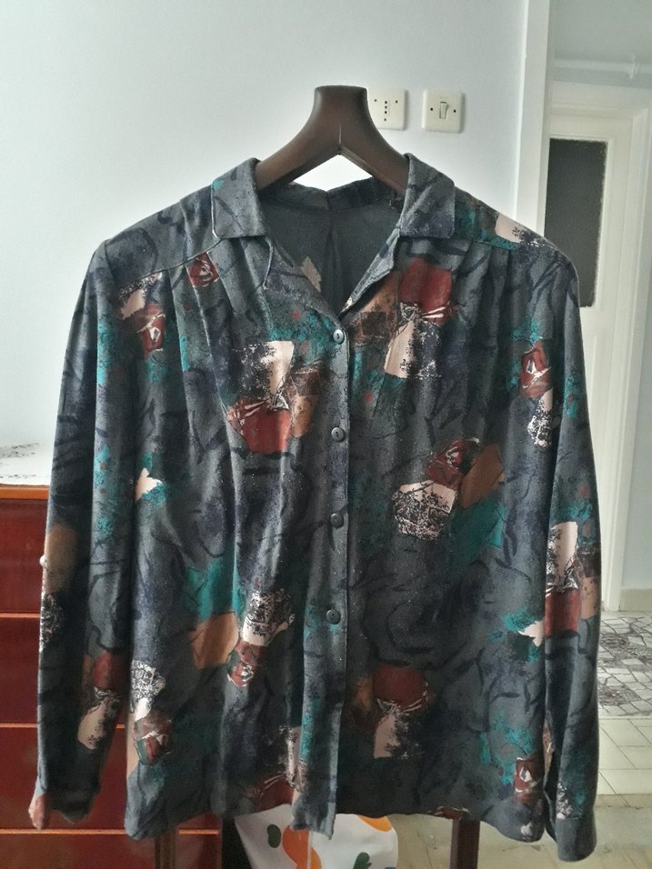Kadınlar için uzun kollu, yakalı ve düğmeli gömlek.Kumaşı yumuşacıktır. Batik desenli, kahverengi ve koyu tonlarda, bol kesim ve midi boyda. Vintage bohem tarzda, günlük kullanıma uygun. Az kullanıldı, hasarsızdır. fazlalıktan satıyorum.