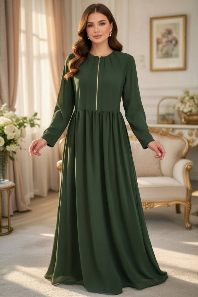 Parlak haki renkte, uzun kollu, yuvarlak yakalı, fermuarlı ve nakış detaylı, bol kesim uzun elbise. Günlük kullanıma uygun, sentetik dokulu kumaştan üretilmiştir.