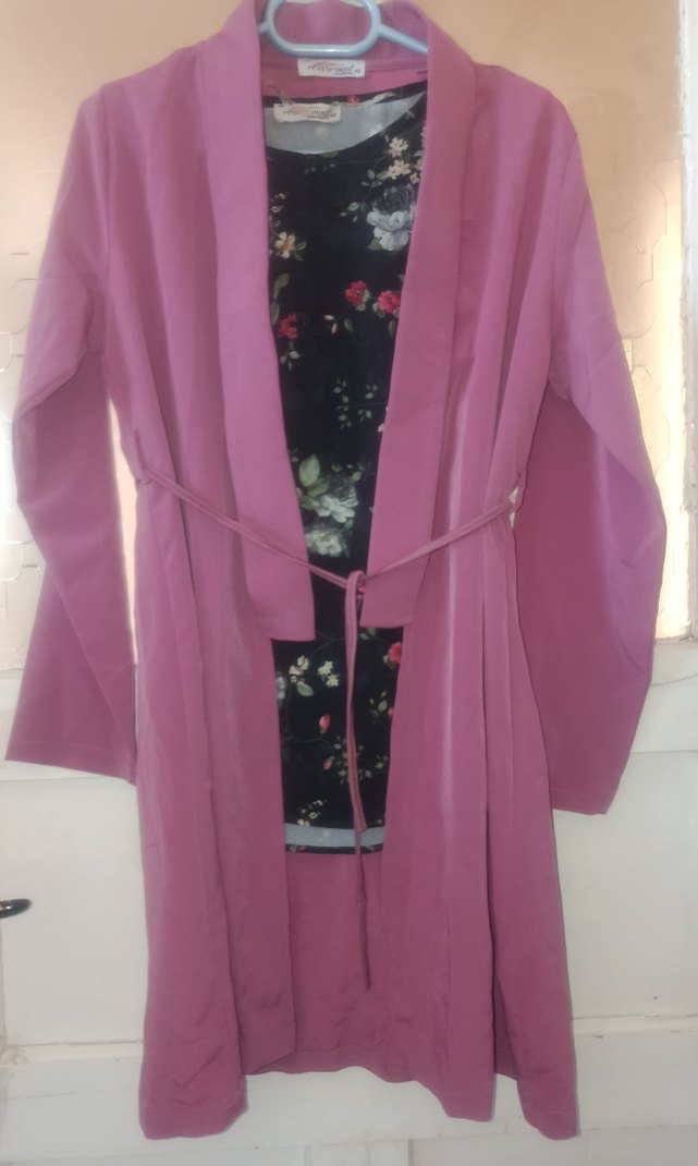 Gül kurusu renkli, uzun kollu ve uzun boyda. Belden bağlama detayı bulunur.