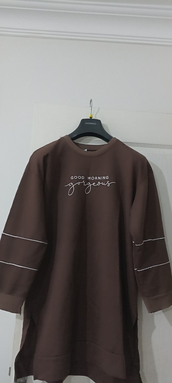 Kahverengi kadın sweatshirt, uzun kollu ve bol kesimdir. Önünde "GOOD MORNING gorgeous" yazısı baskılıdır. Yumuşak ve sıcak kumaştan, rahat ve günlük tarzda bir üründür. ☕