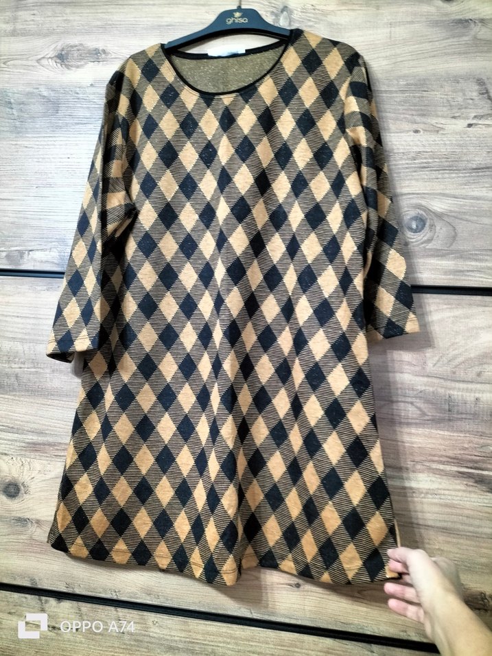 Uzun kollu, yuvarlak yakalı, düğmeli, koyu kahverengi kareli bol kesim midi tunik. Yumuşak sentetik kumaştan üretilmiştir, trend günlük stil için uygundur.