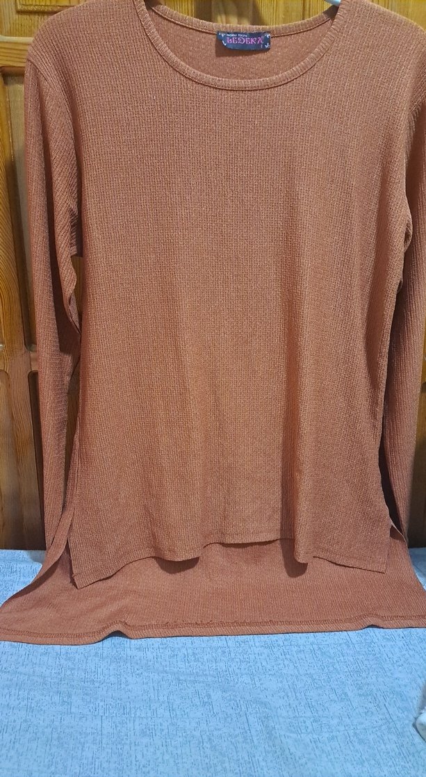 Kadınlar için uzun kollu, bol kesim, bisiklet yaka, koyu turuncu renkte, örme sentetik kumaştan yapılmış uzun bluz . Rahat ve şık bir görünüm sunar.