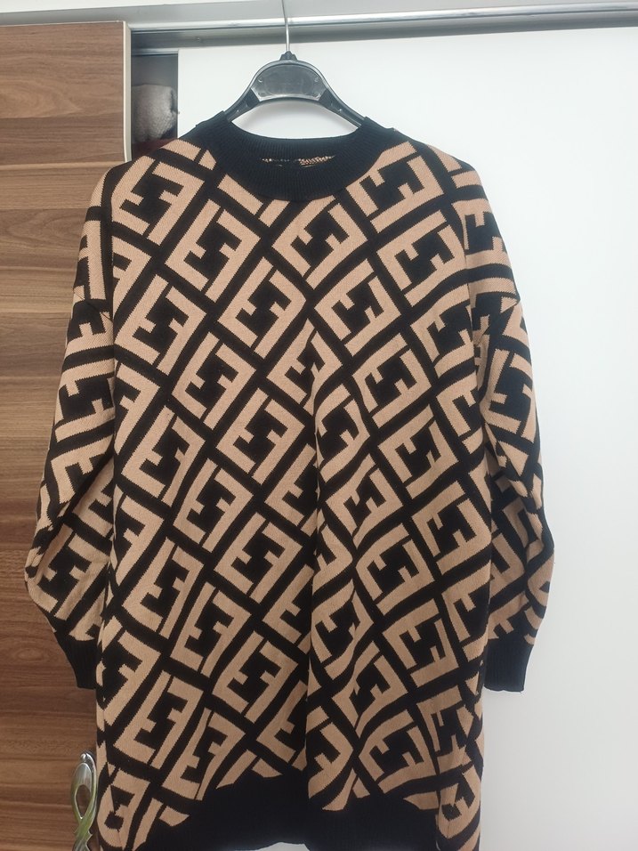 Kadınlar için uzun kollu, bol kesim, baskılı örme desene sahip koyu kahverengi kazak. Yuvarlak yaka ve yumuşak sentetik kumaştan, rahat sokak stili için uygun.