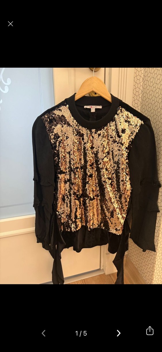 Kadınlar için uzun kollu, bol kesim ve yuvarlak yakalı bluz. Koyu renkli tekstil üzerine altın payet desenleri, romantik akşamlar için ideal. Midi uzunluk ve avangart sokak stiliyle uyumlu. ✨