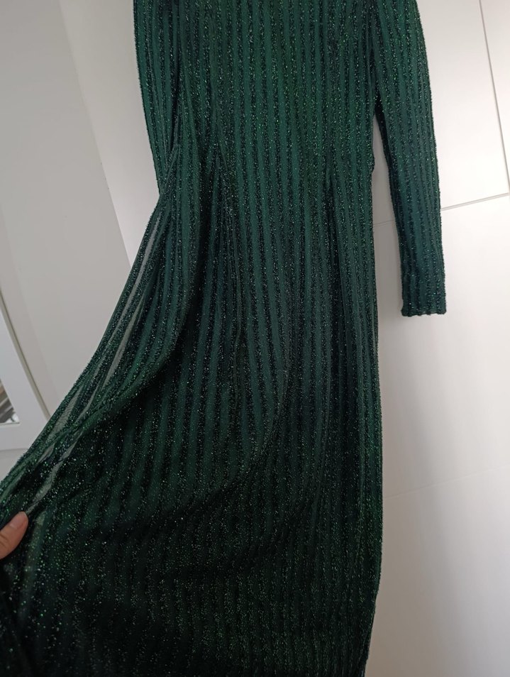 Uzun kollu, pilili ve bohem tarzda, yeşil renkli, vücuda oturan abiye elbisedir. Yumuşak dokulu kumaştan üretilmiştir ve parti için uygundur.