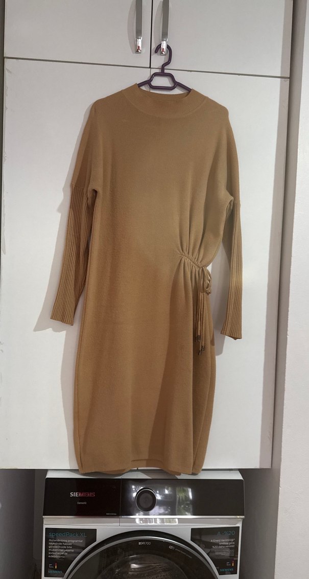 yuvarlak yakalı ve uzun kollu bu uzun elbise, Salaş kesimi ve yan tarafında drapeli detayıyla rahat ve çağdaş bir görünüm sunar.Yün kumaş sıcacık# S/M/L ve XL giydirir#Esnek kumaş #Boy 113 cm# İki koltuk arası 63 cm#