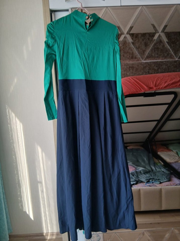 Kadın uzun kollu, salaş kesim ve drapeli uzun elbise. Yuvarlak yaka, koyu tonlarda iki renkli, sentetik kumaştan üretilmiştir.