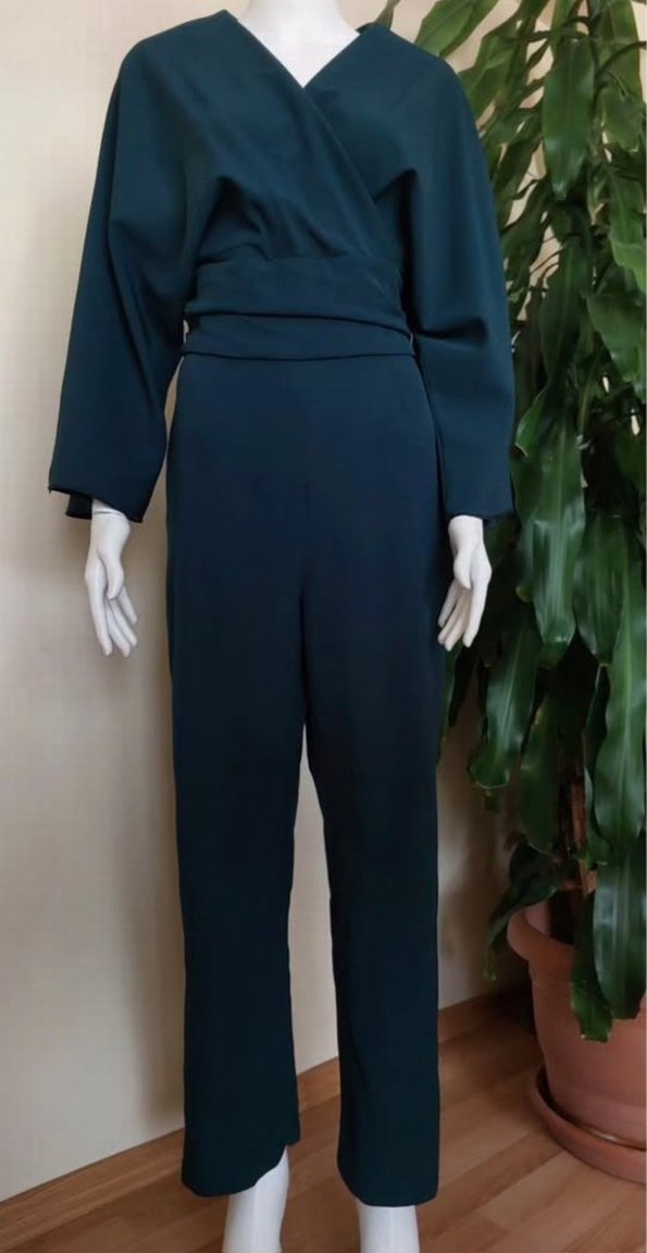 , uzun kollu ve drapeli detaylara sahip kadın tulumu. Sentetik kumaştan, regular fit ve desen içermeyen tasarımıyla ofis için uygundur.