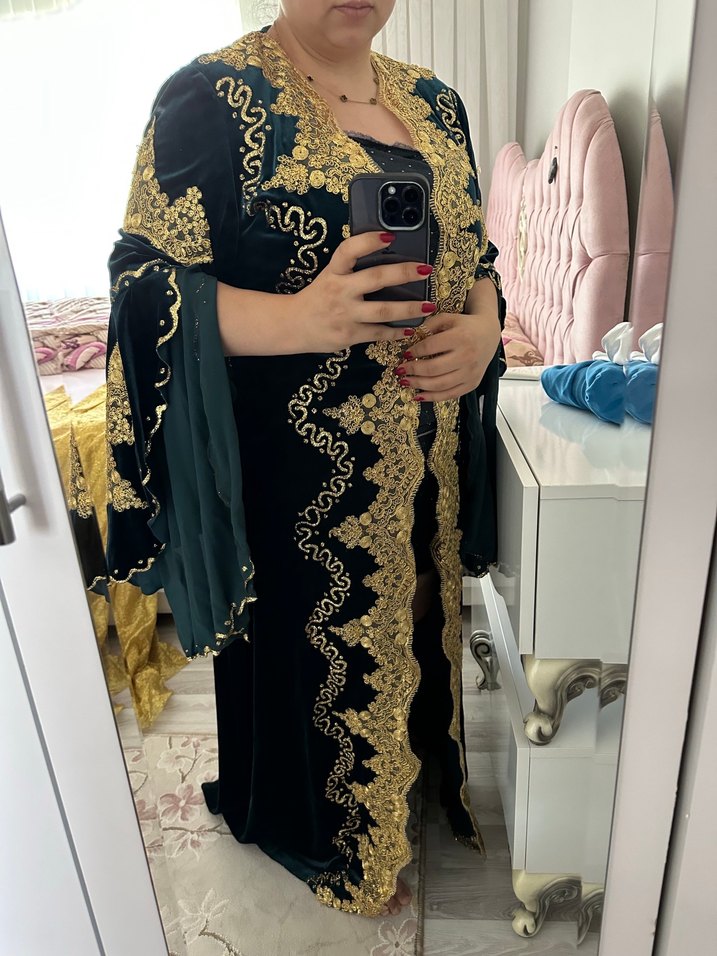 Uzun, bol kesim ve drapeli olan bu Hint elbisesi V yakalı ve uzun kolludur. Koyu altın renkli desenlere sahiptir, içinin elbisesi dahildir
