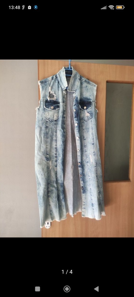 Uzun, kolsuz, askısız yakalı ve düğmeli denim ceket. Bol kesim ve mavi-gri tonlarda batik desenlidir, günlük sokak stili için uygundur.