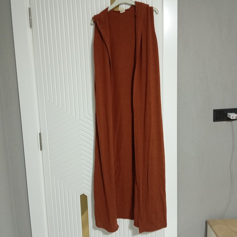 Kadınlar için uzun, kolsuz, bol kesim ve bohem tarzda kahverengi, desen içermeyen rahat bir sabahlık.