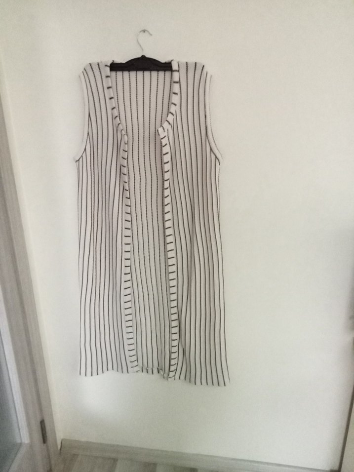 Kadınlar için uzun, V yakalı ve piliseli tasarıma sahip beyaz ve gri çizgili yelek. Kolsuz, regular fit ve sentetik kumaştan üretilmiştir. Günlük sokak stili için uygundur. boy 125 cm iki koltuk arası 50 cm esnek dugmesiz hırka