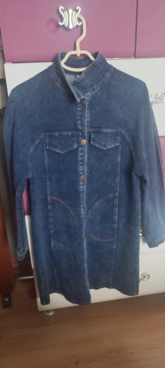 Kadınlar için uzun, düğmeli kot ceket. Normal kesim, uzun kollu ve çentikli yaka detayına sahip koyu lacivert renkte günlük kullanıma uygun. Esnek kumas. 38-40 beden, koltuk altı 51 cm, belinde 50 cm, kalça 52 cm, uzunluk 88 cm