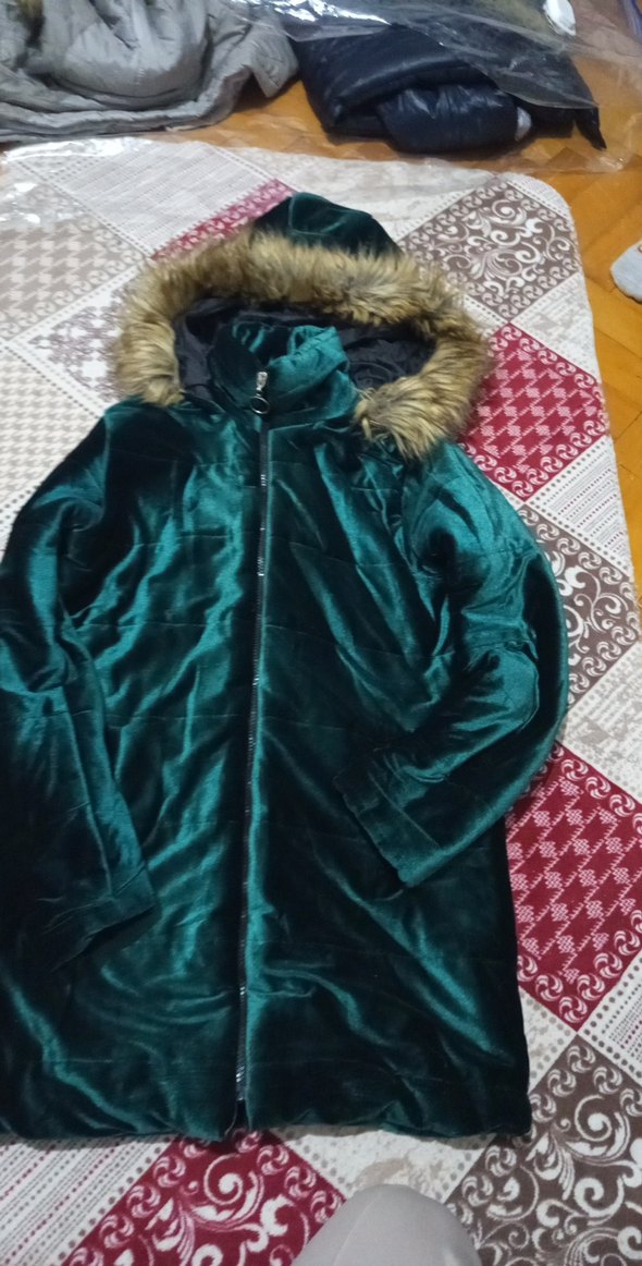 Kadın Uzun Koyu Yeşil kadife Kapüşonlu Kaban 40 beden