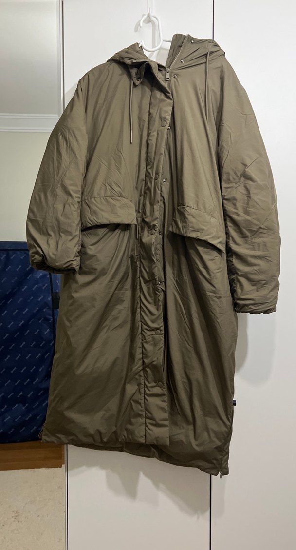Kadınlar için uzun, yüksek yakalı ve fermuarlı -koyu yeşil sentetik kumaştan mont. Bol kesim ve uzun kollu, günlük kullanım için rahat ve konforlu.