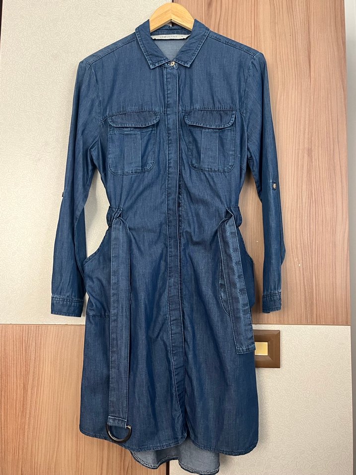 Kadınlar için uzun kesim, düğmeli lacivert denim gömlek. Kap ve gömlek olarak kullanılabilir. Çok az kullanıldı. Defosu yok Beden:38