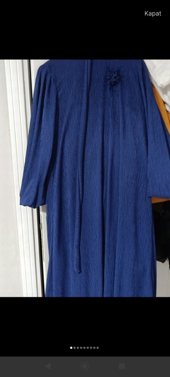 Kadınlar için uzun, salaş kesim ve uzun kollu lacivert elbise. Vintage bohem tarzında, desen içermeyen sade bir tasarıma sahip.