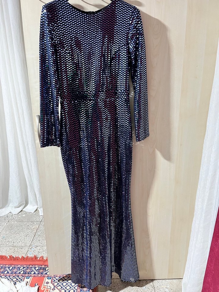 Parlak payetli, uzun ve vücuda oturan bu gece elbisesi, koyu mavi bağlama desenli kumaş ve yuvarlak yakaya sahiptir. ✨