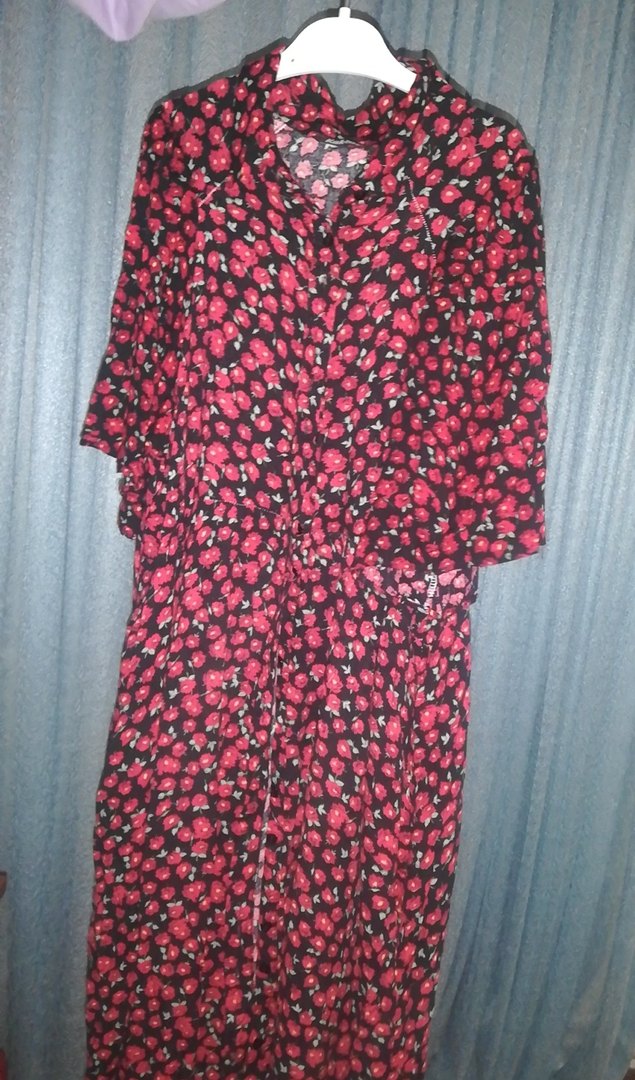 Kadınlar için uzun boy, salaş kesim ve kısa kollu sabahlık, koyu pembe bağlama desenli, rahat ve karşı kültür tarzında.
