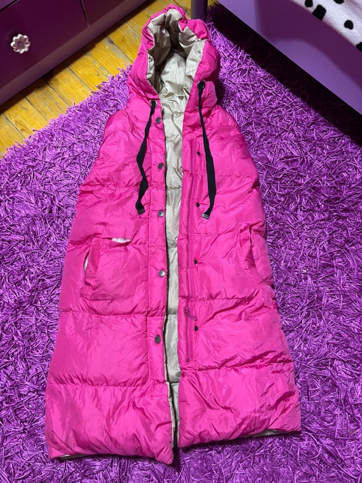 Uzun ve vücuda oturan bu kadın şişme yelek, canlı pembe renkte, kürk detaylı ve yakası kesik yakalıdır. Kolsuz ve yumuşak, sıcak tutan kumaştan üretilmiştir.