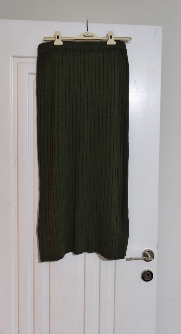 Sıcak yün kumaştan, piliseli ve fitted kesim uzun etek. Koyu haki renkte, rahat normcore tarzında, günlük kullanıma uygun.