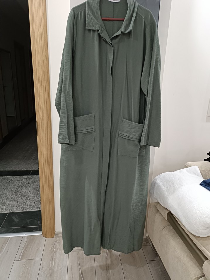 Uzun, salaş kesim kadın hırka, uzun kollu ve haki renkte, minimalist sokak stili için uygun. İki ön cep ve sade yakası bulunur.